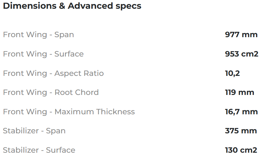 Uma asa dianteira de alta relação de aspecto (High Aspect Ratio), construída para proporcionar um planeio excepcional, bombeamento sem precedentes e desempenho extraordinário em condições de vento a favor (Downwind) e surf pronado (remada).